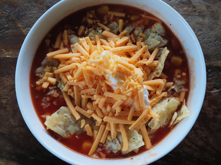 - Top with: cheese, sour cream, and chips